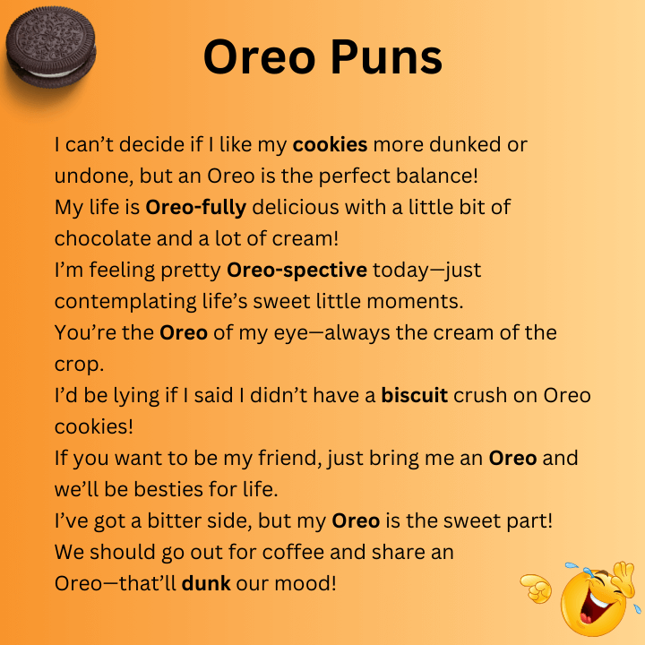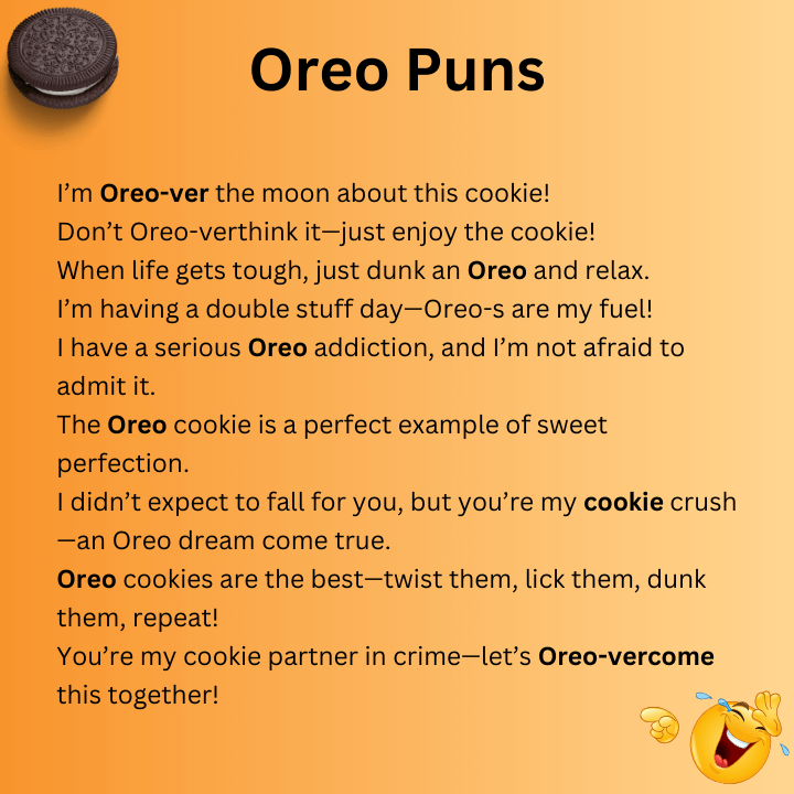 Oreo puns have a special charm because they mix everyday humor with a cookie almost everyone loves. These light and witty lines are perfect for casual laughs or social media captions.